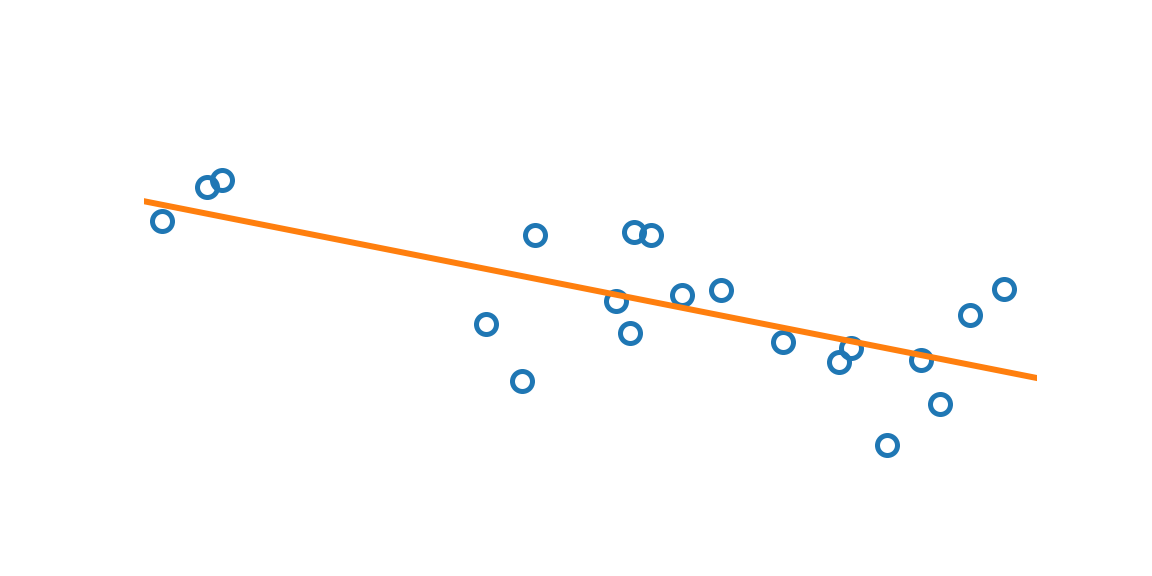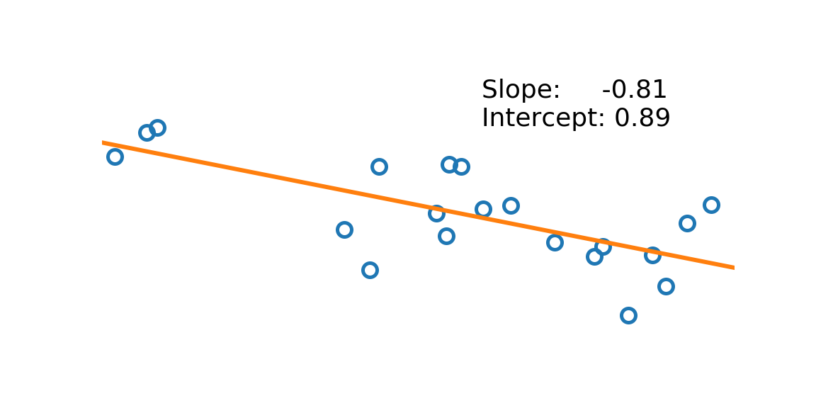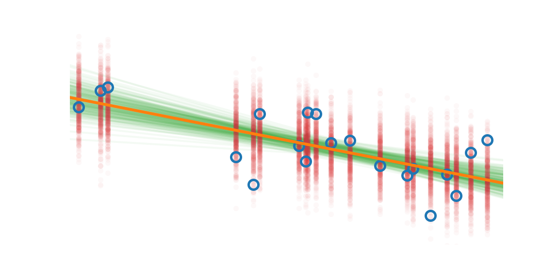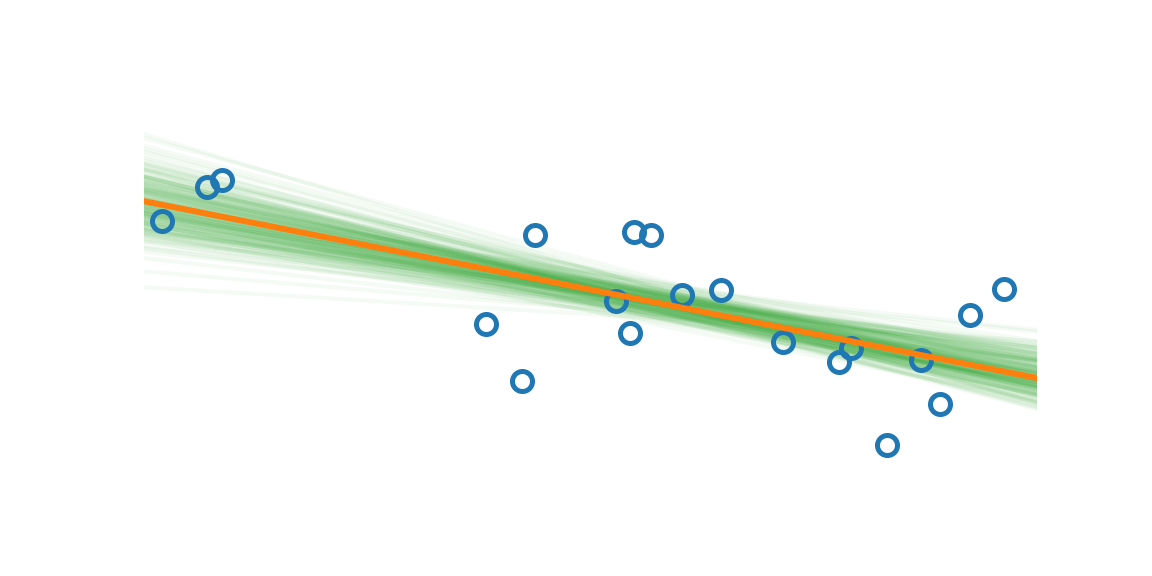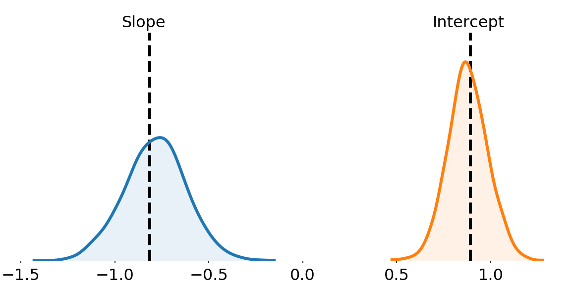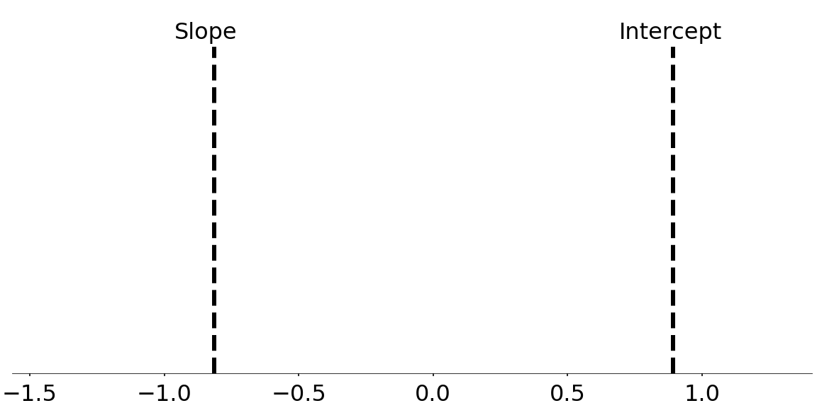 P(\text{slope, intcpt.} | x, y) = \frac{P(x, y | \text{slope, intcpt.}) P(\text{slope, intcpt.})}{P(x, y)}